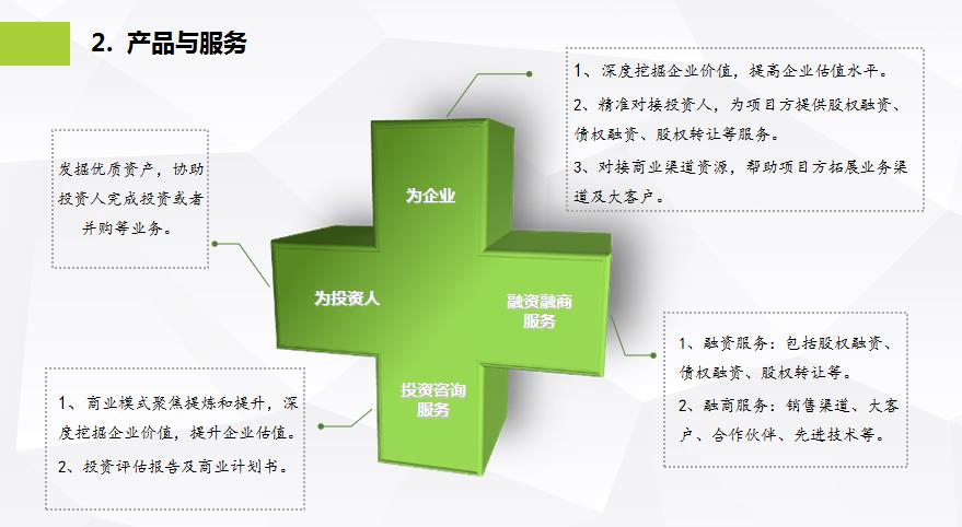 1、融資服務(wù):包括股權(quán)融資、債權(quán)融資、股權(quán)轉(zhuǎn)讓等。