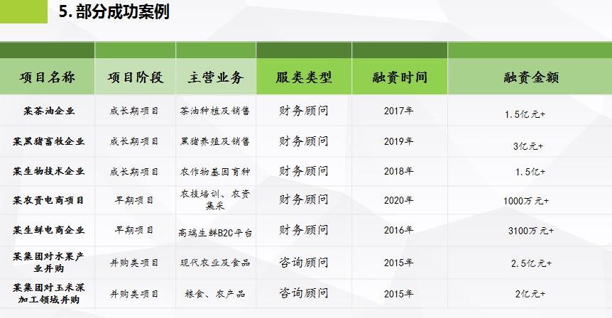 艾格農(nóng)業(yè)投行事業(yè)部成立于2015年,專注于為中國(guó)農(nóng)業(yè)及食品領(lǐng)域客戶提供“咨詢+融資+融商”服務(wù)。我們?yōu)轫?xiàng)目方提供“咨詢+融資+融商”等服務(wù),我們?yōu)橥顿Y人提供“咨詢+并購(gòu)+項(xiàng)目”等服務(wù)。