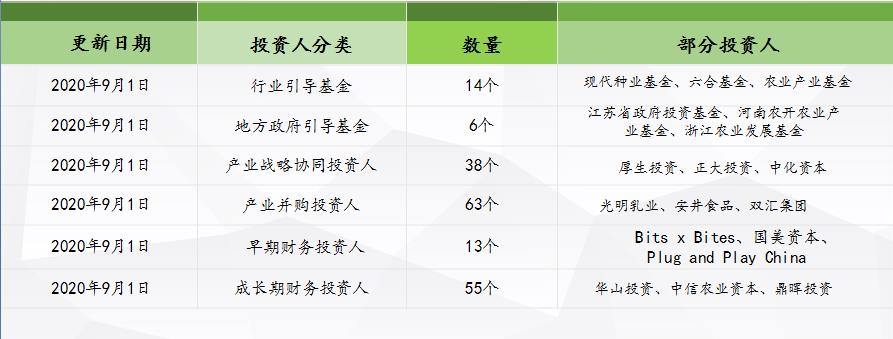 艾格農(nóng)業(yè)投行部數(shù)據(jù)庫,依托艾格農(nóng)業(yè)21年行業(yè)資源,截至2020年9月1日,累計涉農(nóng)涉食品投資人383個,投資人類型為早期財務投資人、成長期財務投資人、并購基金、產(chǎn)業(yè)并購投資人、產(chǎn)業(yè)戰(zhàn)略協(xié)同投資人、行業(yè)引導基金、地方政府引導基金、債權類投資人等。