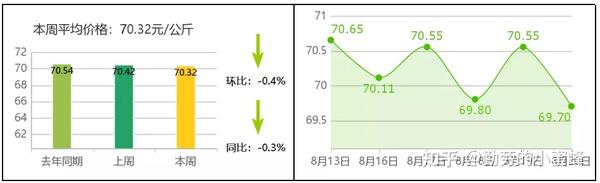 2021年第33周,全國(guó)農(nóng)產(chǎn)品批發(fā)市場(chǎng)羊肉平均價(jià)格為70.32元/公斤,與上周相比,下降了0.4%;與去年同期相比,下降了0.3%;從每日監(jiān)測(cè)數(shù)據(jù)來(lái)看,2021年8月13日~8月20日,羊肉平均價(jià)格從70.65元/公斤波動(dòng)至69.70元/公斤,峰值為8月13日的70.65元/公斤,谷值為8月20日的69.7元/公斤。