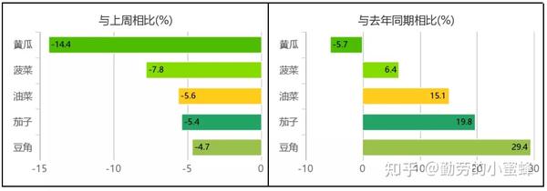 重點(diǎn)監(jiān)測(cè)的全國(guó)286家產(chǎn)銷地批發(fā)市場(chǎng)19種蔬菜中,環(huán)比下降幅度較大的蔬菜變化幅度基本在-4.7%以下。與上周相比,黃瓜降幅最大,高達(dá)-14.4%;與去年同期相比,這幾種蔬菜變化幅度在-5.7%~29.4%之間,其中,黃瓜、豆角變化幅度相對(duì)較大。