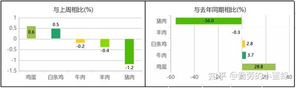 重點(diǎn)監(jiān)測(cè)的畜禽產(chǎn)品(豬肉、牛肉、羊肉、雞蛋和白條雞)與上周相比,變化幅度在-1.2%~0.6%之間,其中,豬肉、雞蛋波動(dòng)相對(duì)較大;與去年同期相比,變化幅度在-56.0%~28.8%之間,其中,豬肉、雞蛋變化幅度相對(duì)較大。