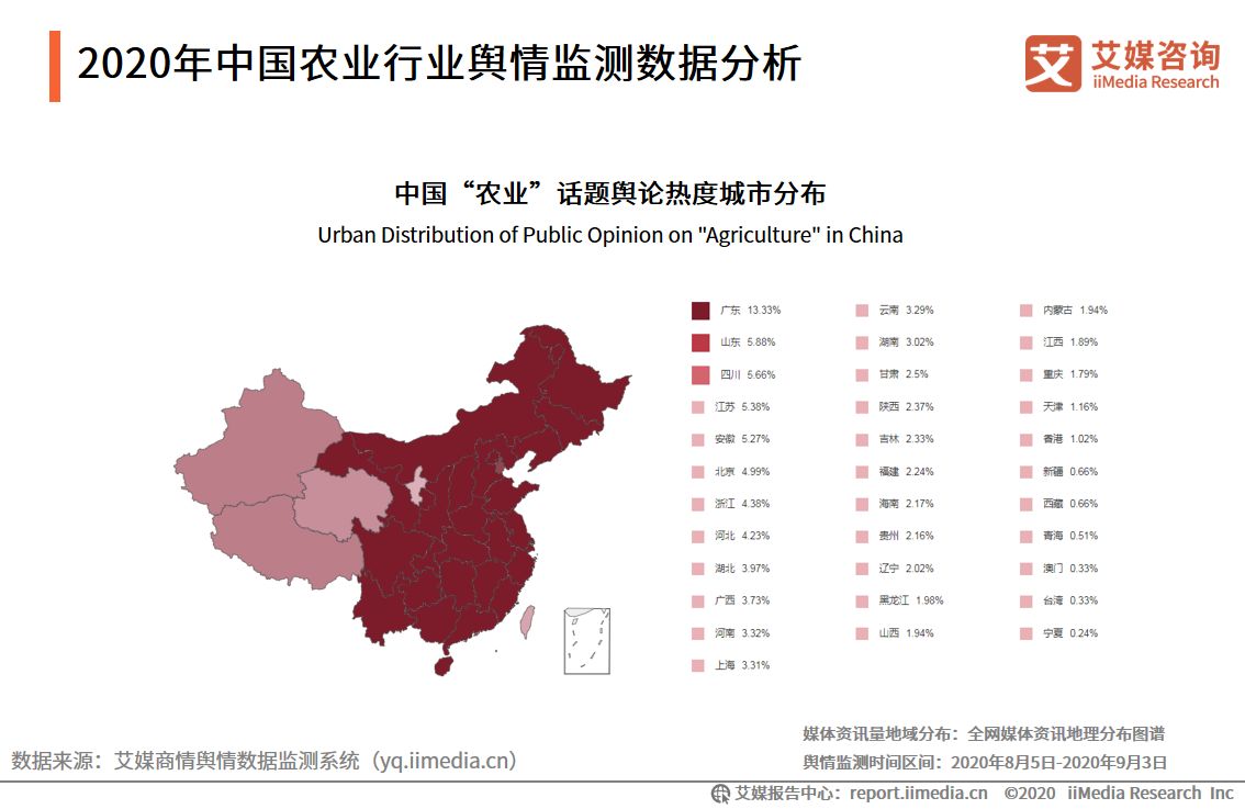 艾媒商情輿情數(shù)據(jù)監(jiān)測系統(tǒng)顯示,監(jiān)測期間,中國東部、中部地區(qū)對農(nóng)業(yè)的話題關(guān)注度較高,這主要是因?yàn)橹袊匾霓r(nóng)業(yè)種植基地,包括長江中下游平原、東北平原、華北平原及四川盆地都處在中西部地區(qū),農(nóng)業(yè)種植業(yè)較為發(fā)達(dá),因而對農(nóng)業(yè)的發(fā)展動(dòng)態(tài)都會(huì)比較關(guān)注。