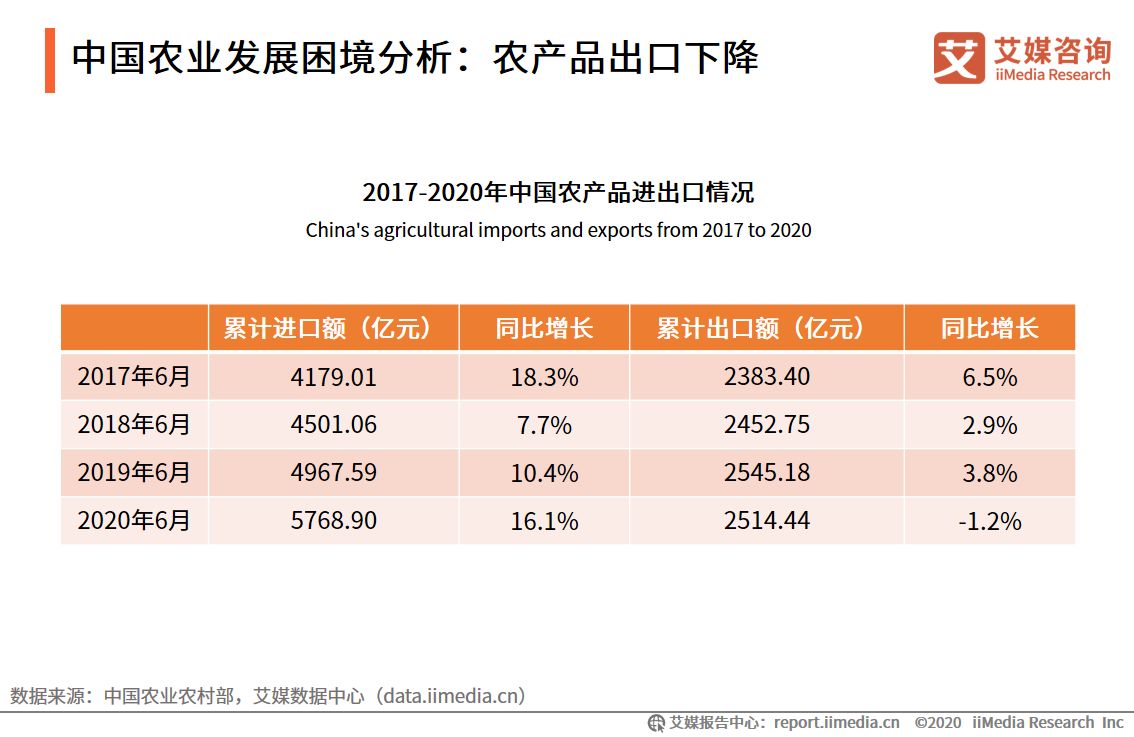 2020年1-6月中國農(nóng)產(chǎn)品進(jìn)出口總額8283.34億元,同比增長10.3%。其中,累計(jì)進(jìn)口額為5768.90億元,增長16.1%;出口額2514.44億元,下降1.2%。艾媒咨詢分析師認(rèn)為,在經(jīng)濟(jì)全球化的背景下,中國農(nóng)產(chǎn)品貿(mào)易額比重不斷提高,但貿(mào)易逆差也在逐年增長,傳統(tǒng)農(nóng)產(chǎn)品國際競爭力不強(qiáng)等問題凸顯。