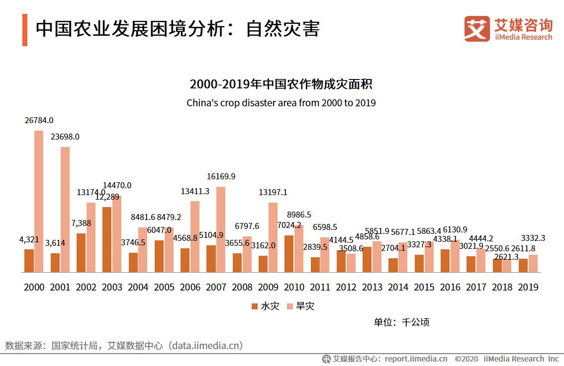 受到全球環(huán)境的影響,中國災(zāi)害較為頻繁,農(nóng)作物受到不同程度的減產(chǎn),主要受到旱災(zāi)和水災(zāi)的影響。2019年,中國農(nóng)作物成災(zāi)面積中,旱災(zāi)和水災(zāi)面積分別達(dá)到3332.3、2611.8千公頃。艾媒咨詢分析師認(rèn)為,2020年中國多個(gè)地區(qū)遭遇暴雨,農(nóng)作物受災(zāi)嚴(yán)重,政府還需加強(qiáng)防汛補(bǔ)救等工作,落實(shí)物資保障。