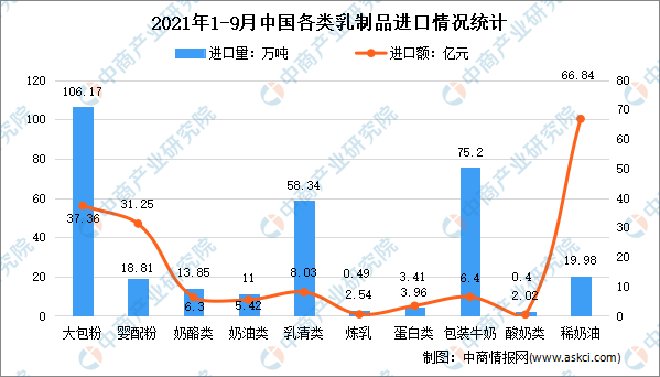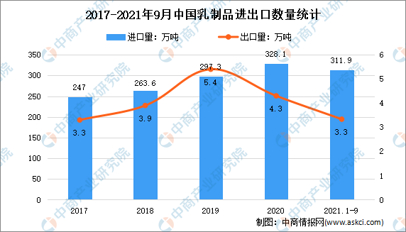 中商情報網(wǎng)訊:2021年1-9月我國共計進(jìn)口各類乳制品311.86萬噸,同比增長27.5%,進(jìn)口額105.9億美元,同比增長15.7%,折合生鮮乳1815萬噸,同比增長26%。2021年1-9月我國共計出口各類乳制品33327.73噸,同比增加2.2%,出口額24785.2萬美元,同比增長48.3%,2021年9月我國共計出口各類乳制品3485.93噸,同比減少27.6%,出口額1999.94萬美元,同比下降29.9%。