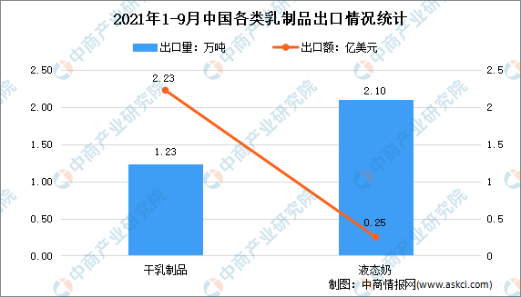 2021年1-9月出口干乳制品1.23萬噸,同比增加22.5%,出口額22282.13萬美元,同比增長55.7%。