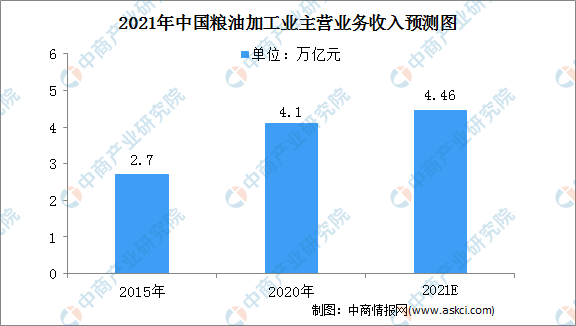 根據(jù)國家糧食局發(fā)布的《糧油加工業(yè)“十三五”發(fā)展規(guī)劃》預測,預計2020年中國糧油加工業(yè)主營業(yè)務(wù)收入將達到4.1萬億元,主營業(yè)務(wù)收入過100億元企業(yè)數(shù)量將達到30家。預計2021年中國糧油加工業(yè)主營業(yè)務(wù)收入將達到4.46萬億元。