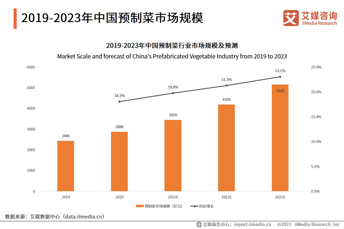 iiMedia Research(艾媒咨詢)數(shù)據(jù)顯示,2019年中國(guó)預(yù)制菜市場(chǎng)規(guī)模約2445億元,B端市場(chǎng)為1956億元,C端市場(chǎng)489億。2021年中國(guó)預(yù)制菜市場(chǎng)規(guī)模預(yù)估為3459億元,同比增長(zhǎng)18.1%。隨著消費(fèi)升級(jí)以及冷鏈物流布局,預(yù)制菜市場(chǎng)將向BC端同時(shí)加速發(fā)展,之后將以20%的增長(zhǎng)率逐年上升,2023年中國(guó)預(yù)制菜規(guī)模約為5165億元。
