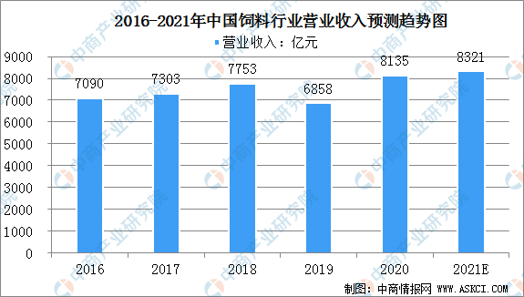 截止到2020年中國飼料行業(yè)的營業(yè)收入為8135億元,預(yù)計2021年將達(dá)8321億元。