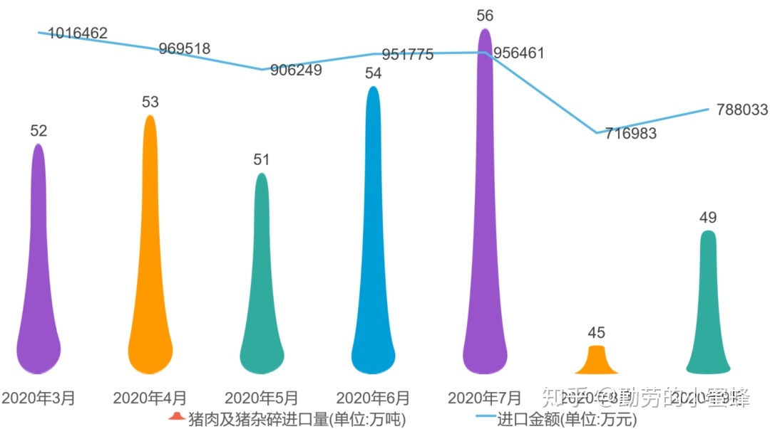 2. 從外貿(mào)數(shù)據(jù)來看:2020年3~9月中國豬肉及豬雜碎進(jìn)口數(shù)量、金額較2019年增幅均在60%以上。目前已累計進(jìn)口豬肉及豬雜碎432萬噸,較2019年高出93.5%;價值7783971萬元,較2019年高出165.4%。其中3~4月受前期疫情影響,進(jìn)口規(guī)模突增;5~7月因?yàn)閲鴥?nèi)生豬產(chǎn)能尚未完全恢復(fù),進(jìn)口規(guī)模逐月增加;9月因?yàn)閲鴳c、中秋等一系列節(jié)假日的刺激,進(jìn)口規(guī)模再次季節(jié)性增加。