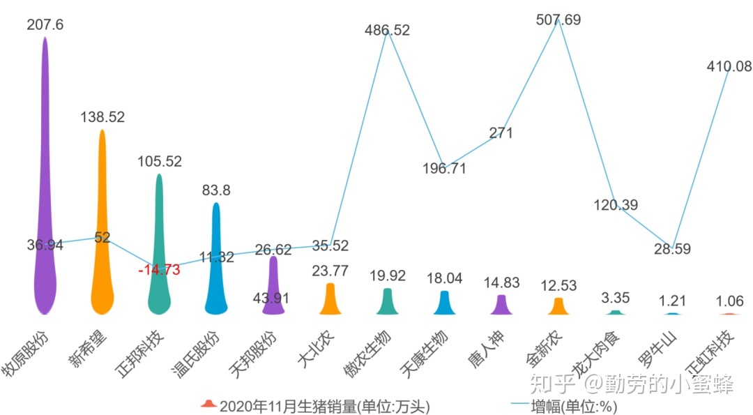 從2020年11月生豬銷量排名來看,牧原股份207.6萬頭居首,新希望138.52萬頭居其次,正邦科技105.52萬頭排名第3。