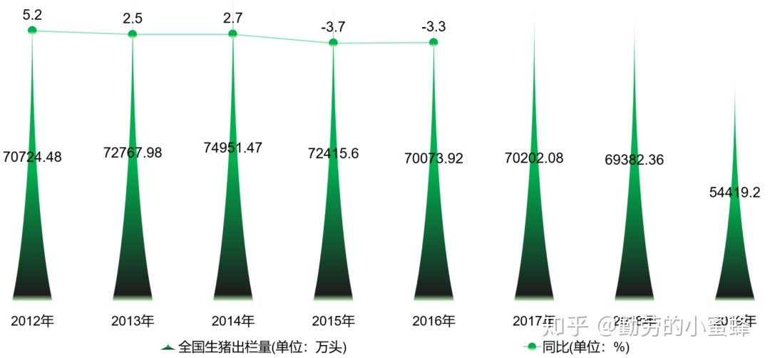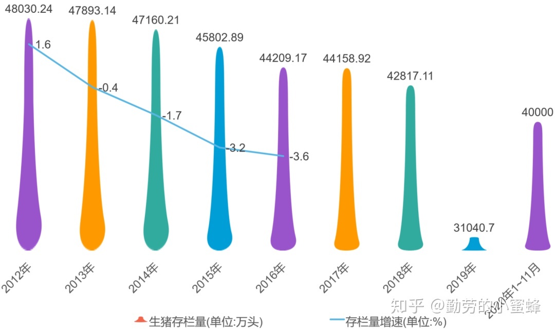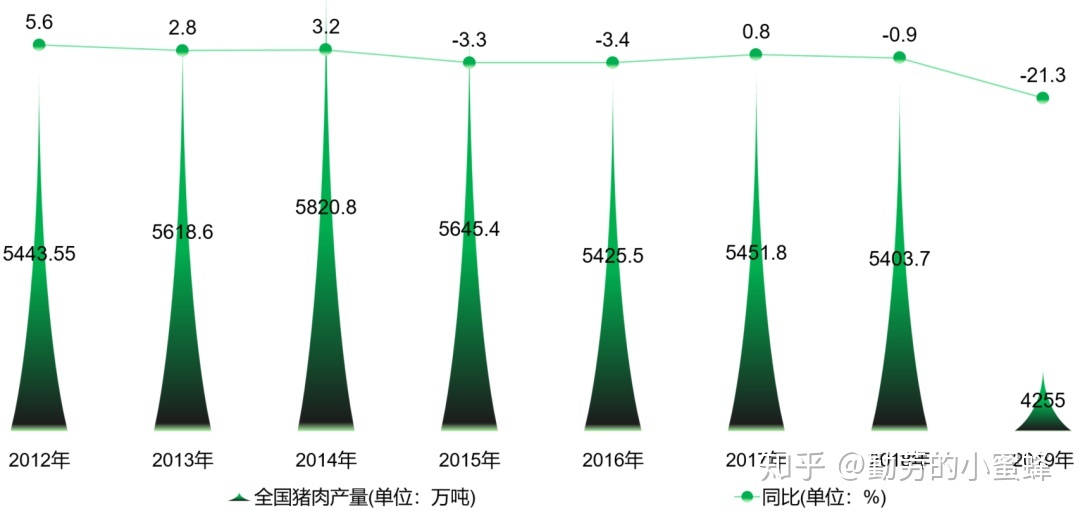 2012到2018年中國生豬存欄量的持續(xù)下降,主要是由于消費(fèi)需求的減少,2019年減幅高至27.5%,主要是因?yàn)榉侵挢i瘟及各地盲目拆建的影響。