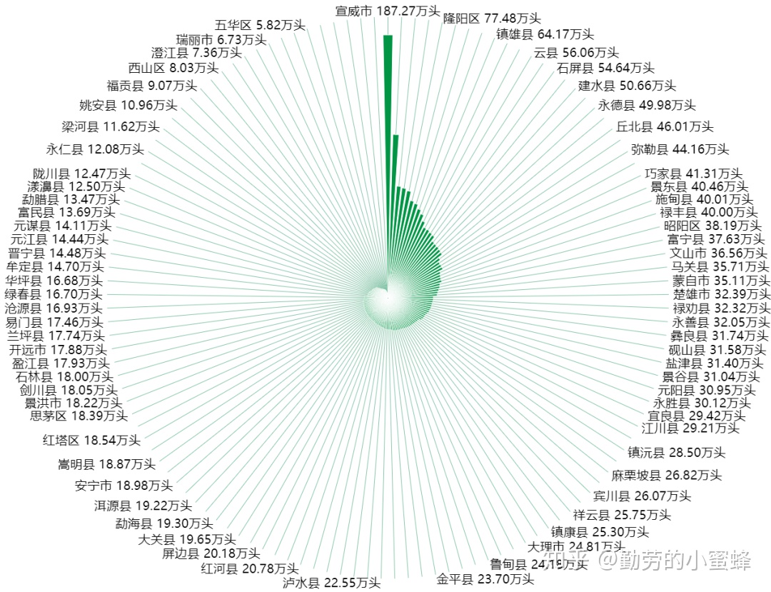 細(xì)化到縣域,統(tǒng)計口徑相對一致的2010年底云南省各縣域豬肉產(chǎn)量數(shù)據(jù)顯示:豬肉產(chǎn)量最多的前6個縣域均來自曲靖市。具體數(shù)據(jù)依次是:宣威市357005噸、會澤縣188001噸、陸良縣136955噸、富源縣128376噸、羅平縣106083噸、麒麟?yún)^(qū)99605噸。