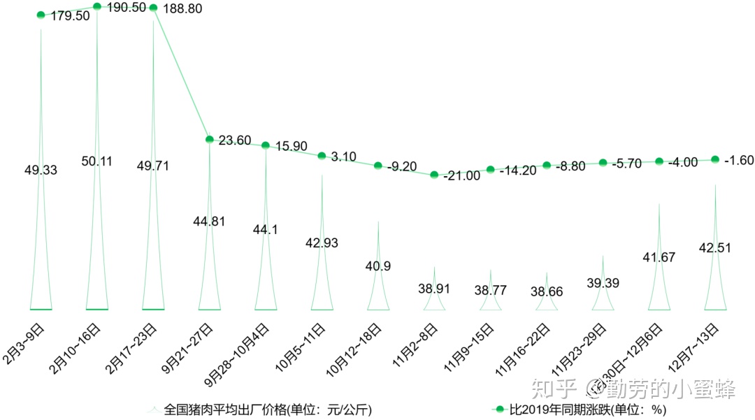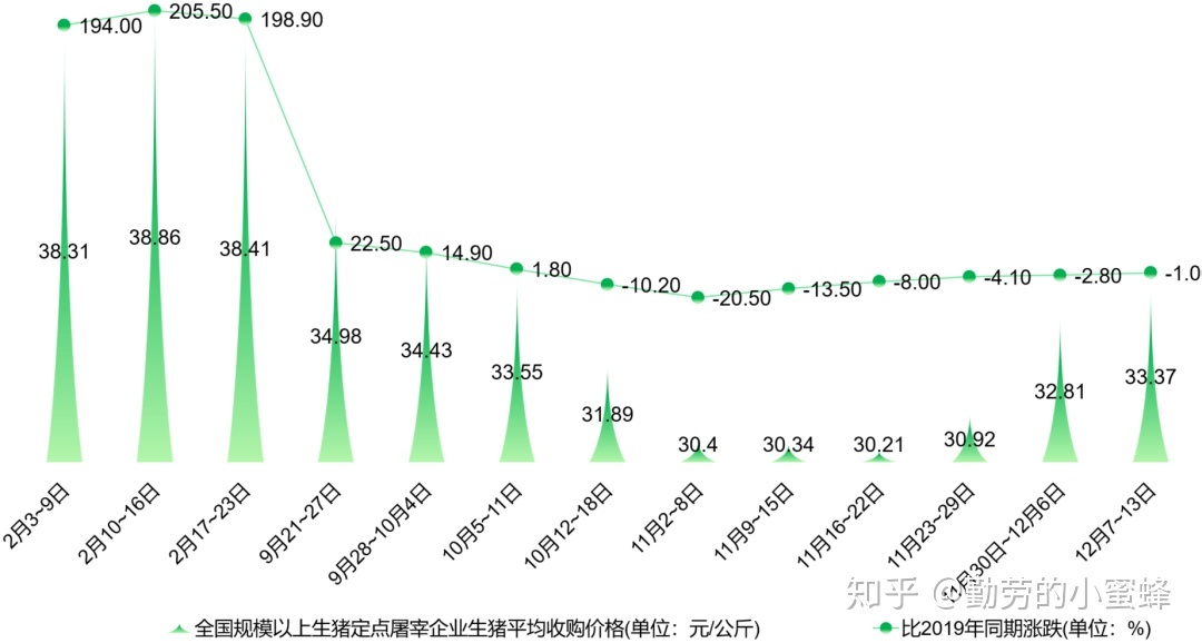 2020年第8周(即:2月17~23日)豬價首降;第42周(即:10月12日~18日)生豬及豬肉價格同比環(huán)比雙降,全國規(guī)模以上生豬定點(diǎn)屠宰企業(yè)生豬平均收購價格為31.89元/公斤,環(huán)比下降5.0%,較2019年同期下降10.2%;第45周與2019年相比跌幅最大,達(dá)20.5%;此后的幾個周生豬平均收購價連續(xù)下跌,而后又波動上升至11月30日~12月6日的32.81元/公斤、12月7日~12月13日33.37元/公斤,與2019年的差距則逐漸縮小至1%。