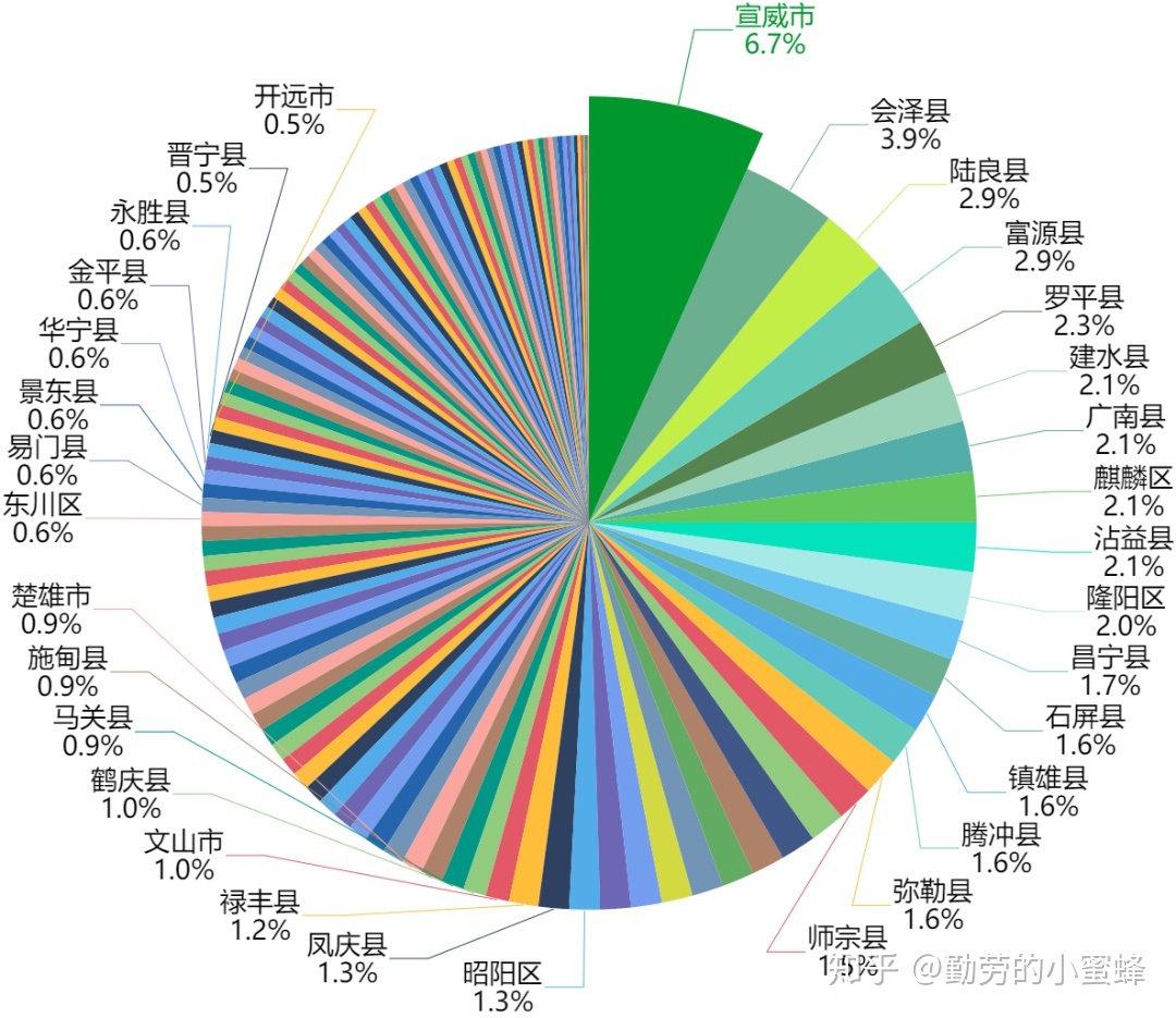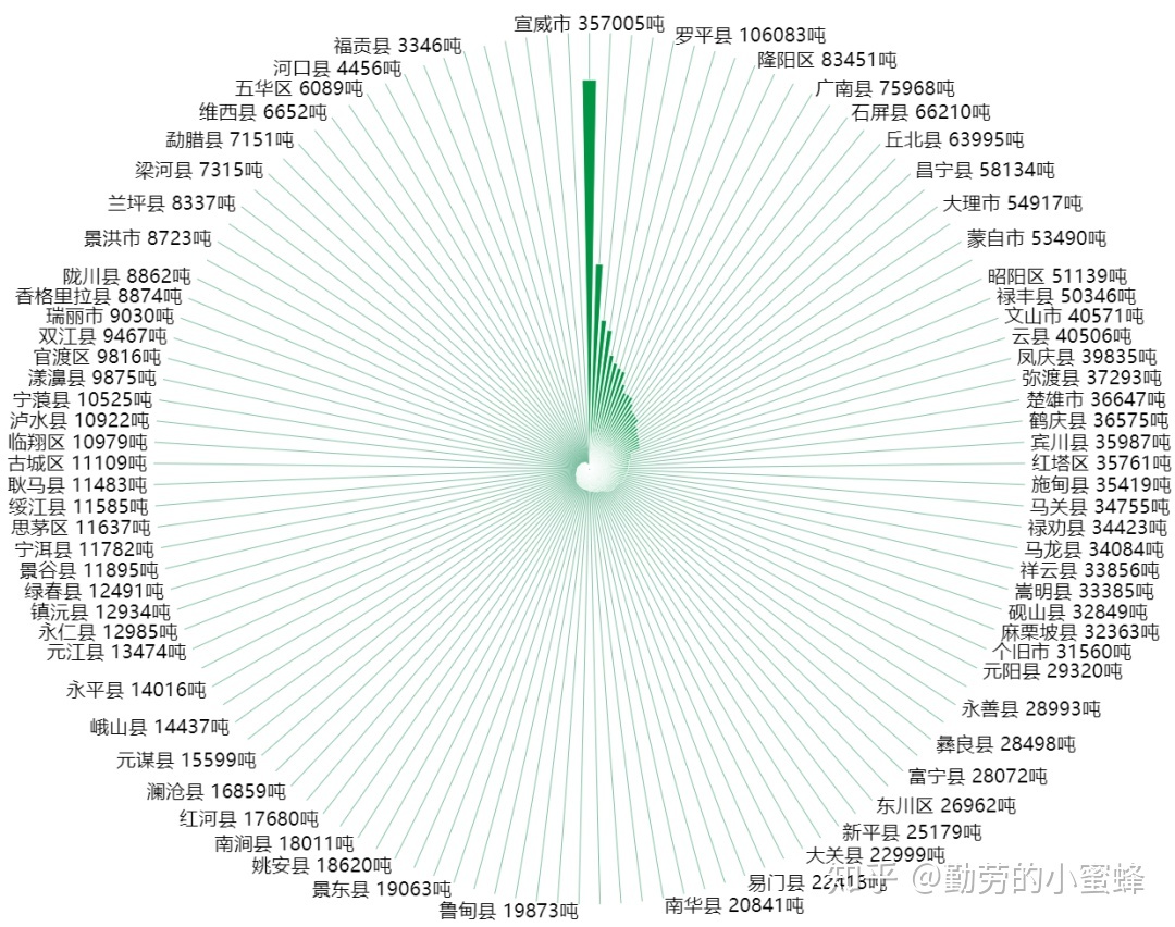 產(chǎn)量較少(不到3000噸)的縣域主要為:普洱市的西盟縣2155噸,昆明市的盤龍區(qū)2137噸、呈貢206噸,迪慶州的德欽縣1526噸,怒江州的貢山縣1377噸。