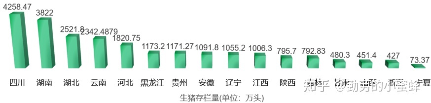 2019年底,中國豬肉產(chǎn)量、生豬出欄量、生豬存欄量最多的均為四川,其中存欄量規(guī)模約為4258.47萬頭,在全國占比達(dá)13.7%;湖南以3822萬頭排第2,占比約12.3%;湖北2521.8萬頭排第3,占比約8.1%;云南省2342.4849萬頭,占比約7.5%。