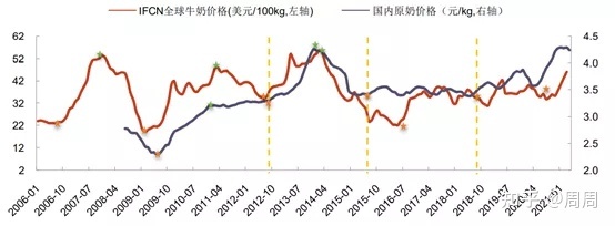 第二,原奶是一個周期性行業(yè),利潤不穩(wěn)定。因為牛奶會有一個產(chǎn)奶周期,所以也導(dǎo)致了供需沒法即使快速匹配,即使下游需求激增,供應(yīng)也沒法一下子出來,這就導(dǎo)致了上游的利潤波動也比較大,大約3年為一個周期。