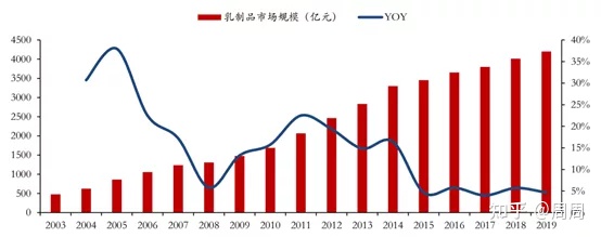另外還有一個重要的影響因素是行業(yè)的增速開始下滑。受到三聚氰胺事件影響,我國乳制品行業(yè)的增速在08年曾下滑到5%,但是隨后仍然保持高速增長。直到15年以后,中國乳制品行業(yè)已經(jīng)連續(xù)5年增長都接近5%,說明需求端已經(jīng)開始飽和。