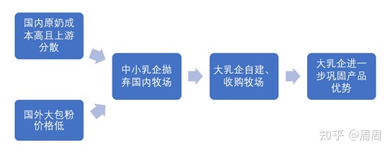 最終的結(jié)果就是中國奶牛存欄數(shù)量停滯不前,同時大型乳企慢慢控制一些優(yōu)質(zhì)的牧場,后來者想再去介入難度則會指數(shù)級增加。