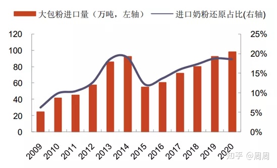 而像大豆、苜蓿這些飼料主要都是依賴外國進(jìn)口,最終導(dǎo)致國內(nèi)原奶的成本比外國進(jìn)口奶粉的價格還要高接近三分之一,一些小型乳企從成本角度考慮就會使用進(jìn)口大包粉加工為復(fù)原乳。