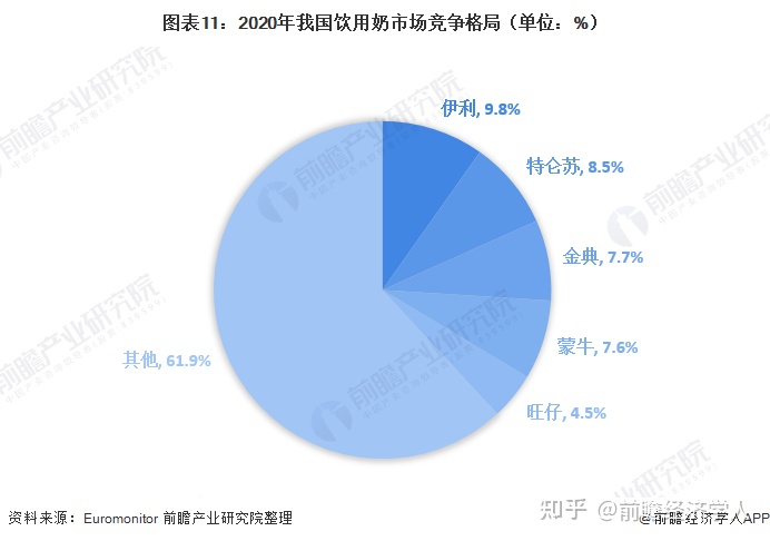 從飲用奶細(xì)分市場品牌占比來看,伊利、特侖蘇、金典奶占據(jù)飲用奶市場的前三,合計占比達到26%。伊利為行業(yè)龍頭品牌,市場份額為9.8%。