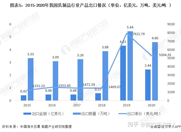 出口方面,受海外疫情蔓延、貿(mào)易摩擦、內(nèi)外價差等影響,根據(jù)海關(guān)總署數(shù)據(jù)顯示,2020年全國乳制品出口合計4.60萬噸,金額2.44億美元,同比下降19.90%和46.81%。