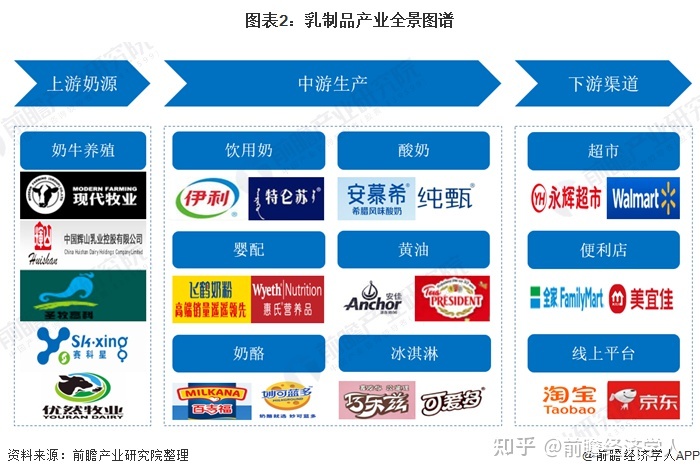 乳制品產(chǎn)業(yè)鏈涉及多個行業(yè)和企業(yè),上游主要參與者有奶牛養(yǎng)殖企業(yè)現(xiàn)代牧業(yè)、乳山、圣牧、賽科星、優(yōu)然牧業(yè)等;中游乳制品生產(chǎn)重點企業(yè)主要有伊利、安慕希、飛鶴等乳制品品牌;下游的重點流通渠道則包括沃爾瑪、永輝等大型商超,全家、美宜佳等便利店以及淘寶、京東等線上平臺。