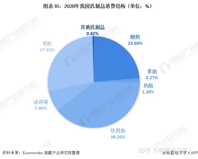 目前我國乳制品消費以飲用奶為主,2020年其銷售規(guī)模為2507億元,占比達39.26%。嬰配和酸奶消費分別位列第二、第三,2020年其銷售規(guī)模分別為1764億元、1507億元,占比分別為27.62%、23.60%。