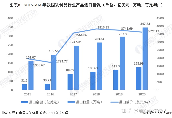 進口方面,根據(jù)海關(guān)總署數(shù)據(jù)顯示,2020年全國共進口各種乳制品347.83萬噸,金額125.99億美元,同比分別增長11.07%和6.22%。
