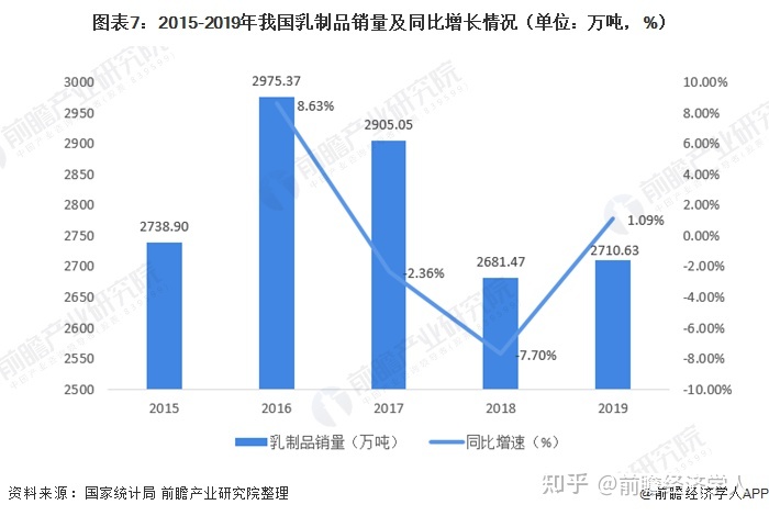 銷量方面,2015-2019年,我國乳制品銷量變化趨勢大體同產(chǎn)量變化趨勢一致。2018年,我國乳制品銷量為2681.47萬噸,較2017年同期下降7.7%。2019年,我國乳制品銷量為2710.63萬噸,較2018年增長1.09%。