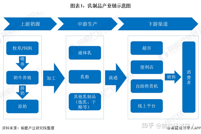 乳制品行業(yè)的產(chǎn)業(yè)鏈較長,涵蓋牧草飼料、奶牛養(yǎng)殖、乳制品加工、終端銷售等多個環(huán)節(jié)。奶牛養(yǎng)殖是乳制品制造行業(yè)的上游環(huán)節(jié),奶牛養(yǎng)殖的產(chǎn)品原奶是乳制品制造的重要原料;中游一般為乳制品加工制造環(huán)節(jié),將上游生產(chǎn)的原奶加工制造成各類乳制品;下游則通過超市、便利店、線上平臺等線上線下渠道將乳制品銷售給消費者。