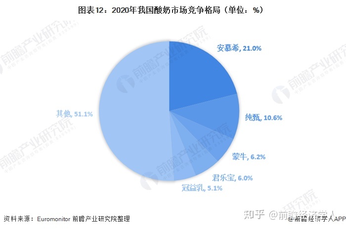 從酸奶細(xì)分市場品牌占比來看,安慕希、純甄、蒙牛占據(jù)酸奶市場的前三,合計占比達到37.8%。安慕希為行業(yè)龍頭品牌,市場份額達到酸奶整體市場份額的五分之一。