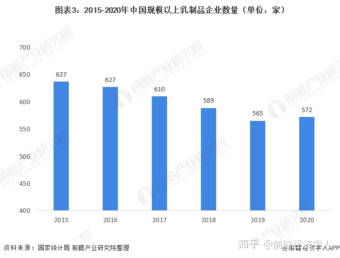 根據(jù)國家統(tǒng)計局?jǐn)?shù)據(jù)顯示,2015-2019年,全國規(guī)模以上乳制品企業(yè)數(shù)量逐年下降,2020年發(fā)生增長。截至2020年12月底,全國規(guī)模以上乳制品企業(yè)達到572家,較2019年新增7家。