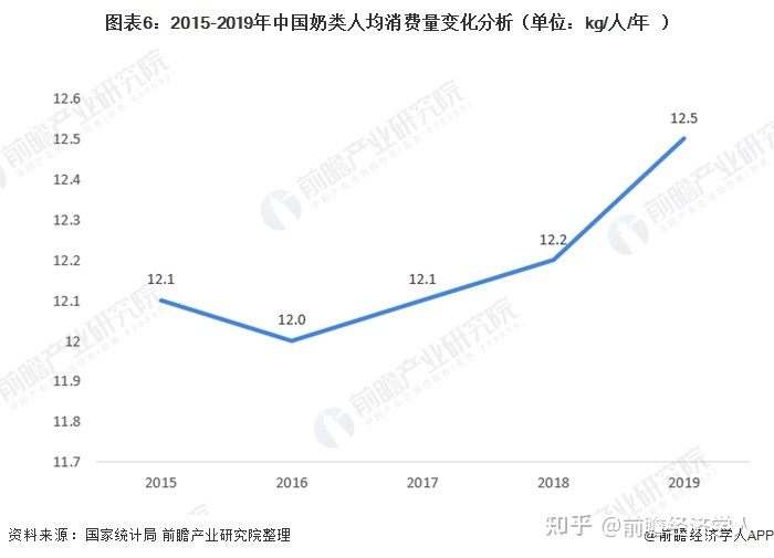 根據(jù)國家統(tǒng)計局《中國統(tǒng)計年鑒2020》的數(shù)據(jù)顯示,2015-2019年我國奶類年人均消費量整體呈現(xiàn)波動上升的趨勢。其中2019年我國奶類年人均消費量為12.5千克/人/年。奶類人均消費量整體維持在12-12.5千克/人/年左右,與世界平均水平相差較大。
