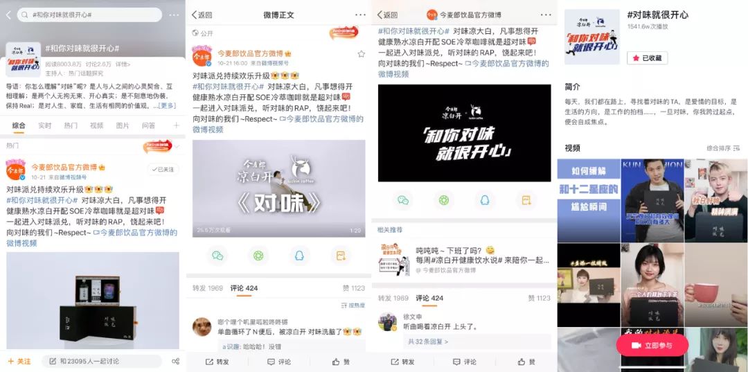 這次聯(lián)名,今麥郎涼白開將陣地選擇在抖音、微博、小紅書和B站等年輕人喜愛的社交媒體上,再結(jié)合“盲盒經(jīng)濟(jì)”,利用網(wǎng)紅直播、達(dá)人開箱、線下體驗等一系列動作,賺足了年輕人的眼球,也激發(fā)了Z世代對于健康熟水“涼白開”的認(rèn)知。截至目前,今麥郎涼白開和瑞幸SOE耶加雪菲的跨界聯(lián)名引爆的“對味”話題在微博(#和你對味就很開心#)和抖音(#對味就很開心)平臺上,已收獲9572萬人次的關(guān)注、參與和互動。