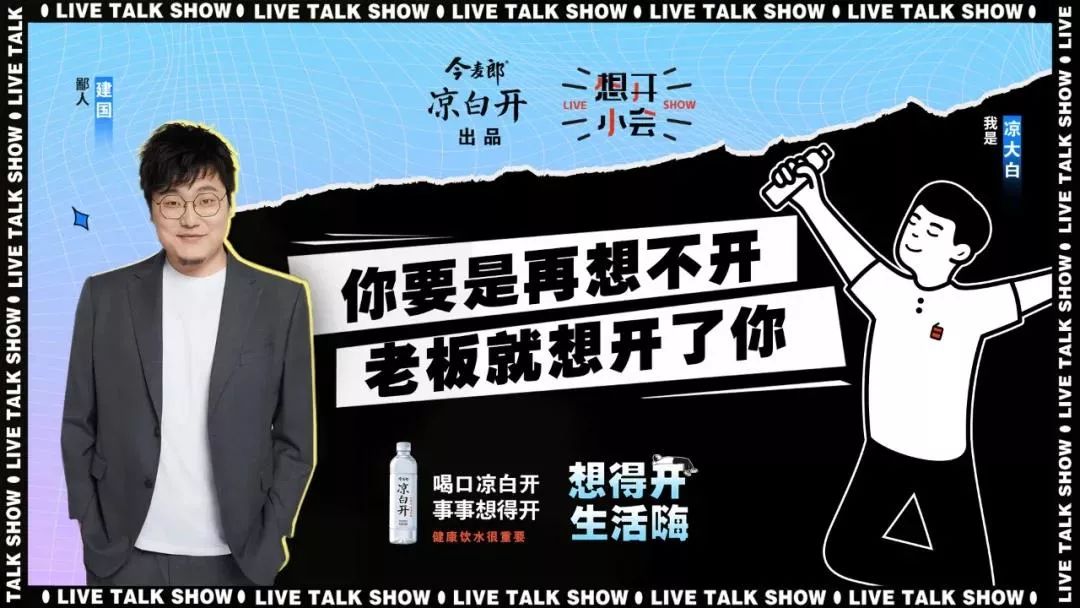 9月,今麥郎涼白開又邀請熱播綜藝《脫口秀大會》中的三位脫口秀達(dá)人:“諧音之王”王建國、“寶藏養(yǎng)生boy”胡豆豆、“帶刺玫瑰”何廣智三位脫口秀達(dá)人組成“想開boys”,召開了一場脫口直播秀《想開小會》,用年輕人的脫口秀語言輸出“涼大白”式樂觀生活態(tài)度。