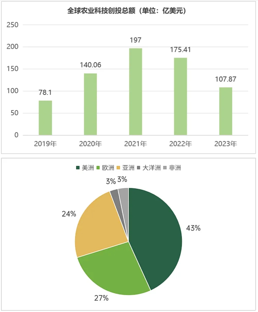 2023年,全球農(nóng)業(yè)科技創(chuàng)投總額為107.87億美元,共計完成1513筆交易。美洲依然是農(nóng)業(yè)科技投資的領(lǐng)先區(qū)域,占全球投資總額的43%。