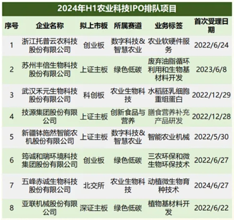 2024年上半年,共有富景中國和康農(nóng)種業(yè)兩家公司農(nóng)業(yè)科技類項目IPO申請成功,合計募資約2.7億人民幣。