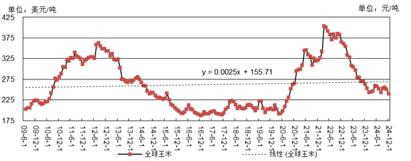 艾格農(nóng)業(yè)數(shù)據(jù)庫顯示,2024年1-12月全球玉米月均價格為250美元/噸,為近四年來最低水平。其中,8月-12月平均價格為248美元/噸,同比下降8.63%。從全球供求關(guān)系及價格趨勢來看,全球玉米價格已基本見底。