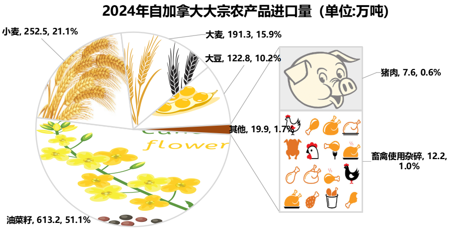 2024年我國自加拿大的油菜籽進口量613.2萬噸,處于進口來源國第一位,占進口總量的96.0%。