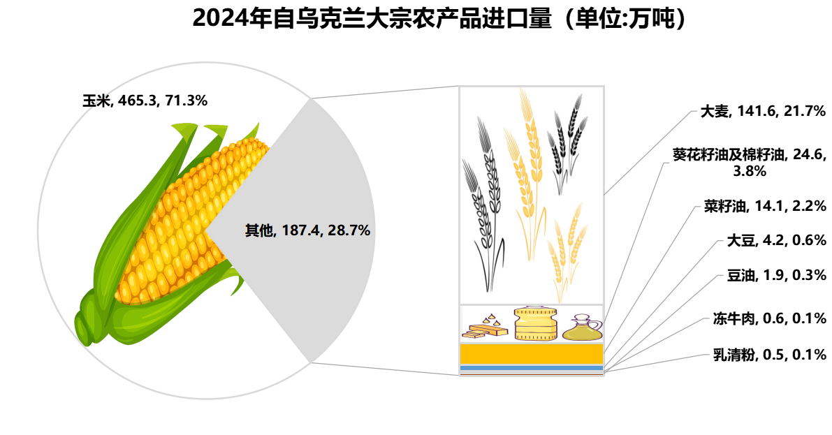 2024年自烏克蘭進口量最大的大宗農(nóng)產(chǎn)品品種為玉米,進口量465.3萬噸,處于第二位;葵花籽油及棉籽油進口量為24.6萬噸,處于第二位;菜籽油和豆油進口量分別為14.1萬噸和1.9萬噸,均處于第四位。