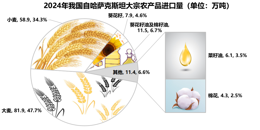 2024年自哈薩克斯坦進口葵花籽7.9萬噸,處于第一位;進口葵花籽油及棉籽油11.5萬噸,處于第三位;進口小麥和菜籽油58.9萬噸和6.1萬噸,均處于第四位;進口大米81.9萬噸,處于第六位。