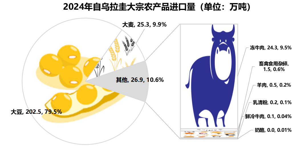 2024年自烏拉圭進口大豆和大麥202.5萬噸和25.3萬噸,排名分別為第四和第十。