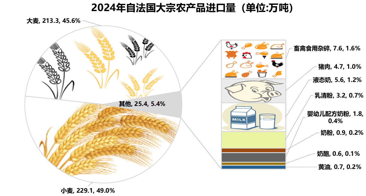 2024年自法國進口小麥229.1萬噸,排名第三,進口大麥、黃油和酸乳處于第二位,進口量分別為213.3萬噸、0.7萬噸和0.2萬噸;進口黃油0.6萬噸,處于第二位;進口液態(tài)奶5.6萬噸,處于第三位。
