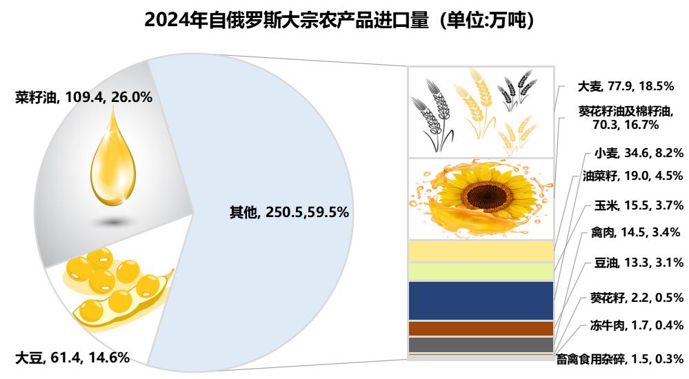 2024年自俄羅斯進口的菜籽油、葵花籽油及棉籽油和豆油處于第一位,分別為109.4萬噸、70.3萬噸和13.3萬噸。