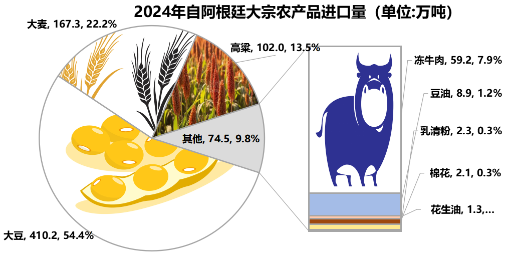 2024年我國自阿根廷進口量最大的大宗農(nóng)產(chǎn)品品種是大豆,進口量為410.2萬噸,處于進口來源國第三位。