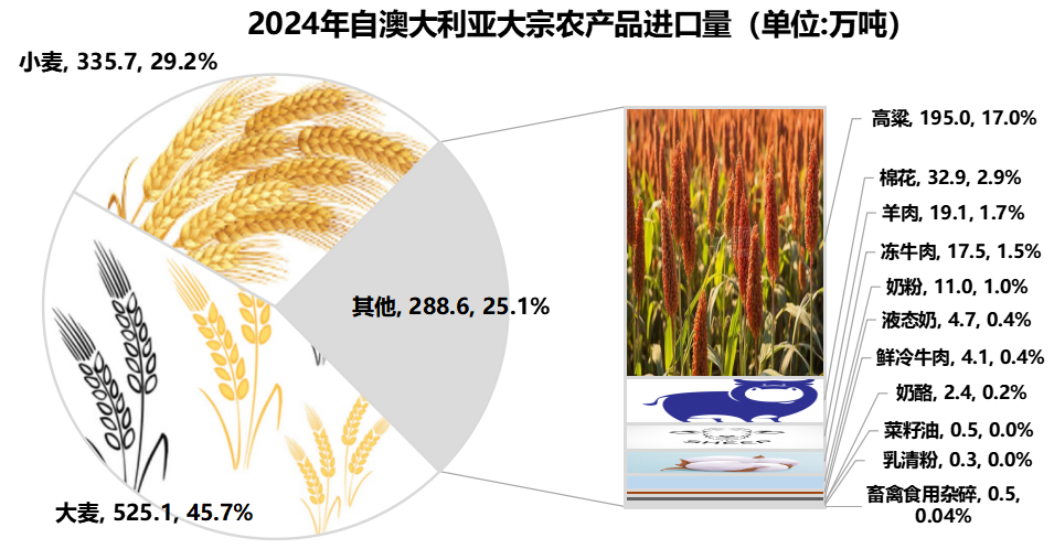 2024年我國自澳大利亞進口的大麥、小麥、羊肉和鮮冷牛肉處于第一位,進口量分別為525.1萬噸、335.7萬噸、19.1萬噸和4.1萬噸;高粱、奶粉和奶酪進口量處于第二位,分別為195.0萬噸、11.0萬噸和2.4萬噸;棉花處于第三位,進口量為32.9萬噸。