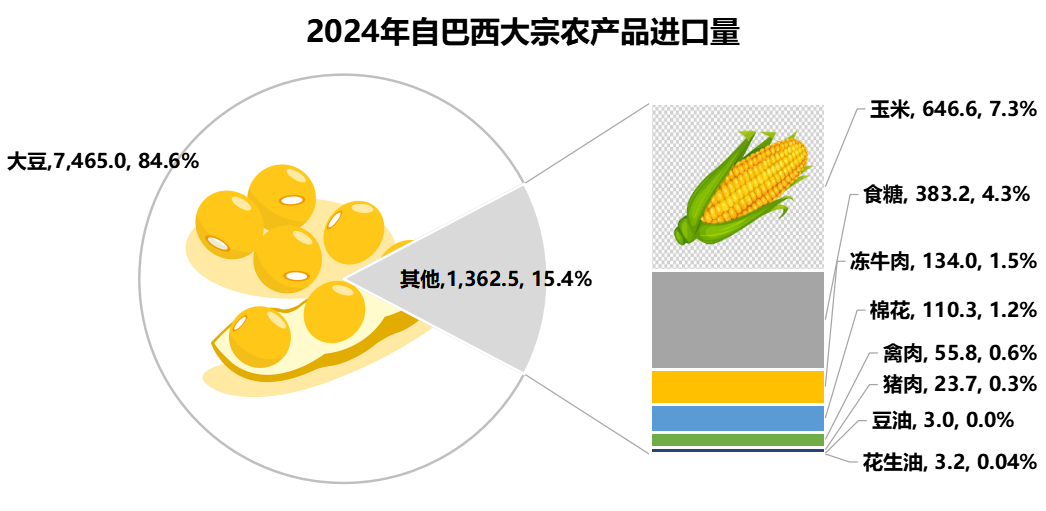 2024年我國自巴西的大豆進口量仍處于第一位,達到7,465萬噸,占大豆進口比例的71.1%;此外,進口量處于第一位的其他農(nóng)產(chǎn)品還包括玉米、食糖、凍牛肉、棉花和禽肉,進口量分別為646.6萬噸、383.2萬噸、134.0萬噸、110.3萬噸和55.8萬噸。