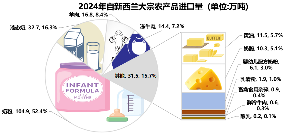 2024年我國自新西蘭進口的奶粉、液態(tài)奶、黃油和奶酪處于第一位,進口量分別達到104.9萬噸、32.7萬噸、11.5萬噸和10.3萬噸;羊肉和嬰幼兒配方奶粉的進口量處于第二位,分別為16.8萬噸和6.1萬噸。